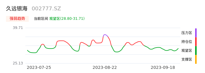 我们来看一下该股的九方特色指标强弱趋势的情况:久远银海自09月06日从持仓区下穿到观望区。股价近期持续下跌后,短期出现止跌迹象。后续重点关注能否再次站上多空分界点:31.71元。如未能有效突破则可能进入新一轮空头行情。