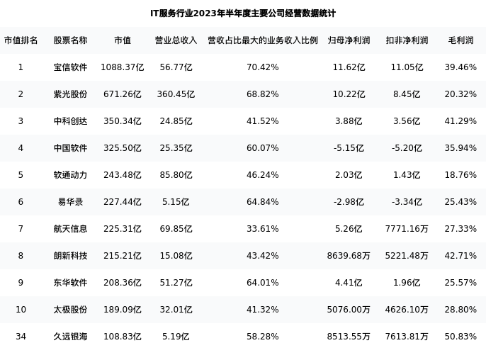 久远银海最新报告期数据为半年度,下表汇总了IT服务行业内市值靠前的公司半年度主要经营数据