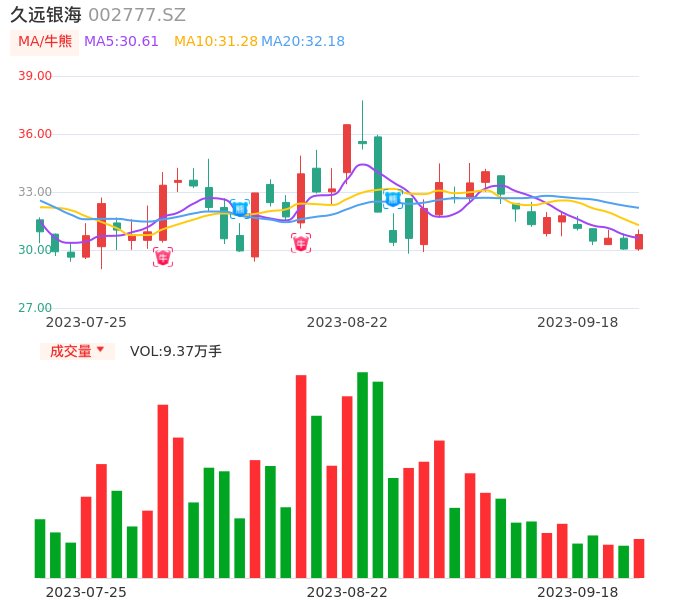 09月18日,久远银海收报30.80,股价涨幅2.50%,成交金额2.86亿元,换手率2.35%。