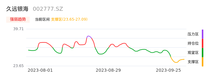 我们来看一下该股的九方特色指标强弱趋势的情况:久远银海自09月20日进入支撑区。股价出现一波快速下跌行情,目前下跌动能仍未衰竭。建议继续谨慎观望。注意今日下方支撑位:23.65元,如有效跌破将可能出现新一轮下跌。