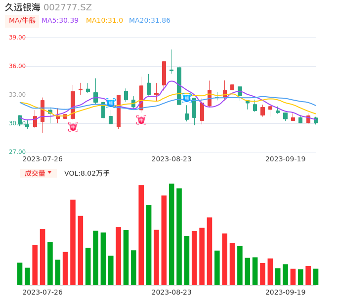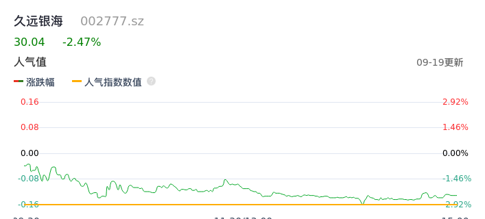 09月19日,久远银海收报30.04,股价涨幅-2.47%,成交金额2.42亿元,换手率2.01%。