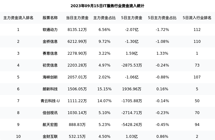 从主力资金流向来看,IT服务行业今日主力资金流入62.01亿元,在所有申万二级行业中排名:26/131。