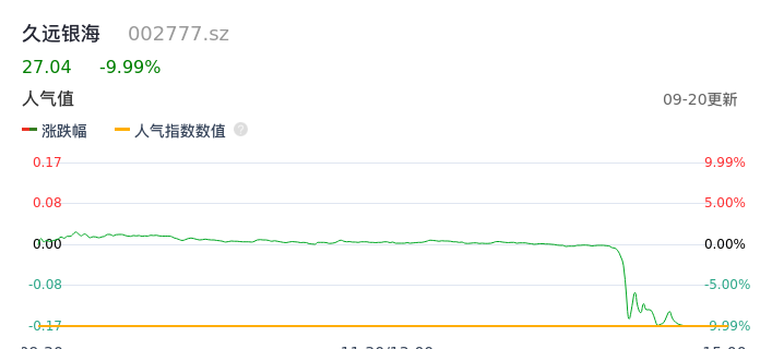 09月20日,久远银海收报27.04,股价涨幅-9.99%,成交金额4.98亿元,换手率4.42%。