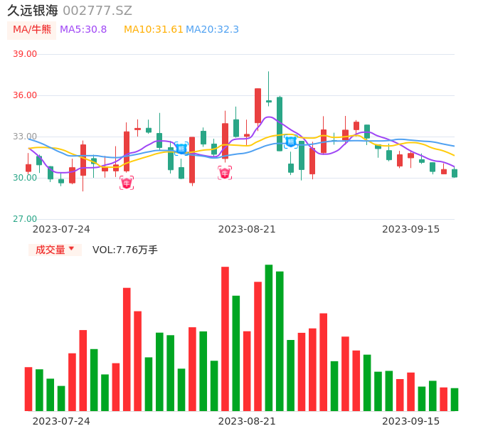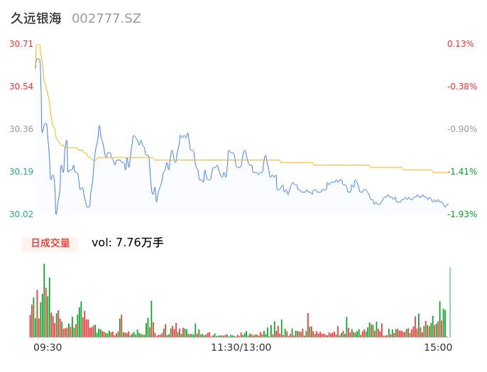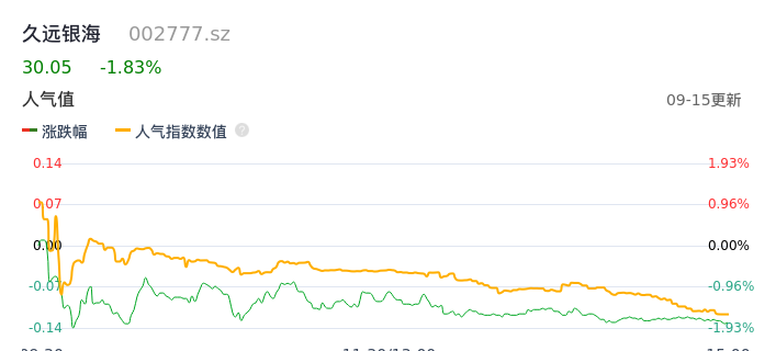09月15日,久远银海收报30.05,股价涨幅-1.83%,成交金额2.34亿元,换手率1.94%。