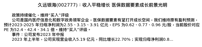 值得注意的是:2023年09月开源证券的陈宝健分析师,首次发布关于久远银海的研究报告,标题为:久远银海(002777):收入平稳增长 医保数据要素成长前景光明。