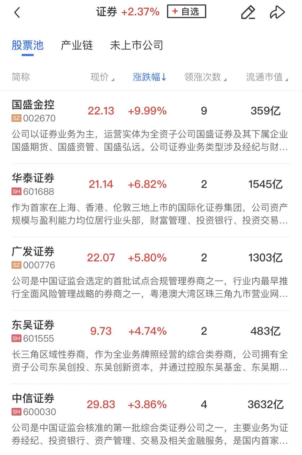 证券板块盘中走强,国盛金控涨停,华泰证券、广发证券、东吴证券、中信证券等涨幅居前。