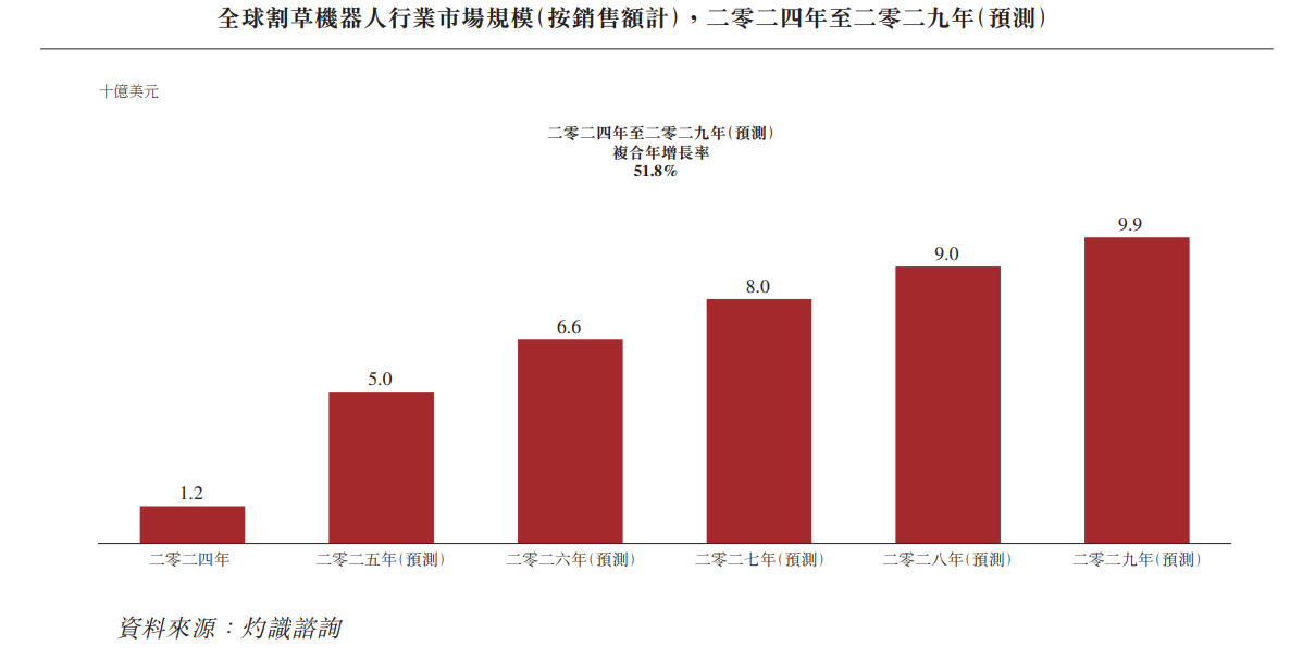 随着行业技术的不断发展和环保法规日益严格,户外动力设备正加速向智能化和锂电池解决方案的方向发展。于2024年之前,割草机器人市场仍处于商业化的早期阶段。随着技术成熟和产品性能迭代,全球割草机器人渗透率不断提升,市场潜力巨大。市场规模预计将由2024年的12亿美元增长至2029年的99亿美元,而2024年至2029年的复合年增长率为 51.8%。