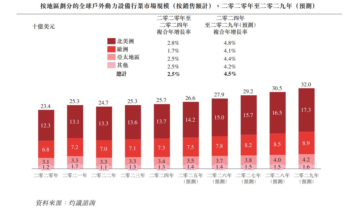 全球户外动力设备市场规模庞大且持续增长,呈现出显著的区域性发展特征。根据灼识咨询的数据,2024年全球户外动力设备市场规模达257亿美元,预计到2029年将增长至320亿美元,年复合增长率为4.5%。随着智能化技术的发展和渗透,智能割草设备具有广阔的市场潜力,有望重塑行业竞争格局。根据灼识咨询的数据,全球智能割草机器人市场规模预计将从2024年的12亿美元增长至2029年的99亿美元,年复合增长率高达 51.8%。这高速增长不仅体现了智能割草设备的庞大市场潜力,也预示着行业格局的深度重塑。