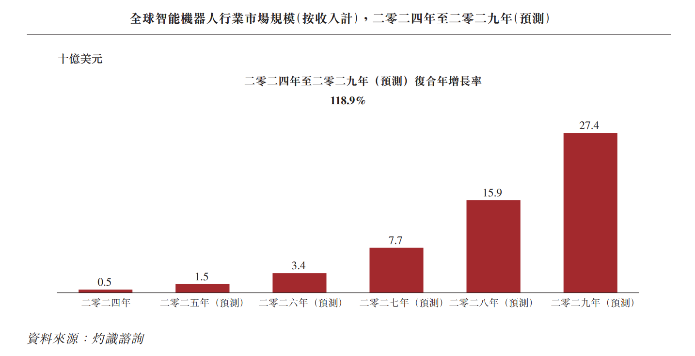 于2024年之前,智能机器人市场仍处于商业化的早期阶段,规模相对有限。随着技术日渐成熟及产品性能不断提升,全球智能机器人市场规模在2024年达到了5亿美元,预计在2029年将增长至274亿美元,复合年增长率为118.9%。