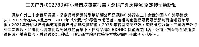 值得注意的是:2024年05月开源证券的任浪/周佳分析师,首次发布关于三夫户外的研究报告,标题为:三夫户外(002780)中小盘首次覆盖报告:深耕户外历浮沉 坚定转型焕新颜。