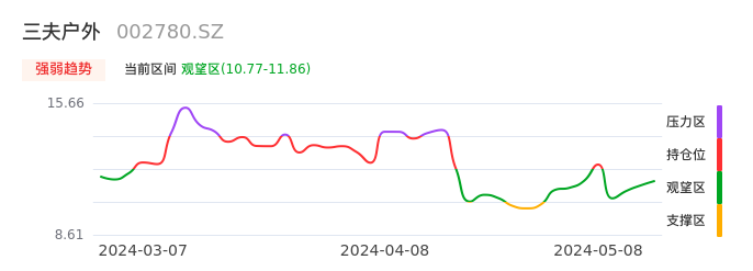 我们来看一下该股的九方特色指标强弱趋势的情况:三夫户外自04月30日从持仓区下穿到观望区。股价近期持续下跌后,短期出现止跌迹象。后续重点关注能否再次站上多空分界点:11.86元。如未能有效突破则可能进入新一轮空头行情。