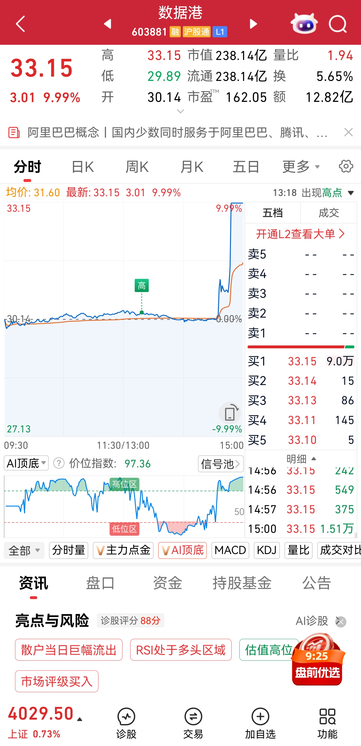 今日尾盘,阿里云概念异动,数据港直线拉升,2分钟涨停;润建股份、奥飞数据等跟涨。