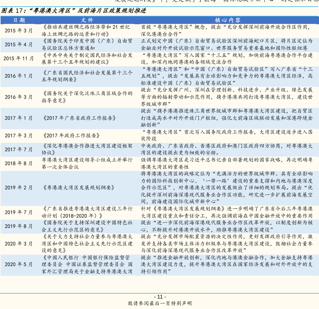 2015 年至今,前海多次出现在粤港澳大湾区规划推进政策文件中,是粤港澳大湾区发展的重点发展区域,2019 年 2 月国务院发布的《粤港澳大湾区发展规划纲要》中,更是赋予了前海,国际化城市新中心‛的定位和目标。