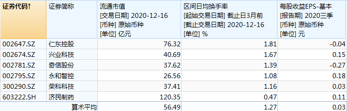 这6只股票今年三季报EPS(每股收益)平均仅为0.03元,仁东控股、奇信股份均因为业绩亏损而导致EPS为负。作为对比,全部A股今年三季报EPS平均值为0.38元。