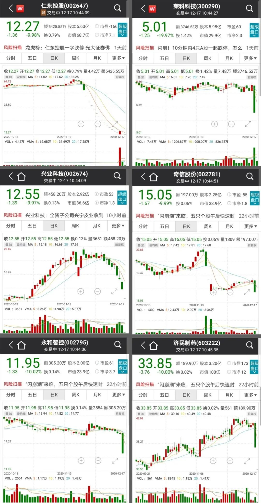 从日线走势上看。今日5只新增的“一字跌停”股票,其日线走势与仁东控股11月末崩盘初期的情形有相似之处,均表现为“闪崩跌停+一字跌停”的日线组合。