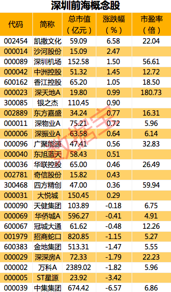数据宝统计显示,A股上市公司中注册地位于前海深港合作区的有两家,包括东方嘉盛、香江控股,办公地址位于前海深港合作区的有凯撒文化。除这三家上市公司外,还有多家上市公司直接或间接参与了前海深港合作区的开发建设,前海概念股共有25只,昨日凯撒文化、沙河股份、深圳机场涨幅居前,分别上涨6.58%、2.47%、1.5%。
