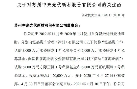 1月11日上午,深交所向中来股份发出关注函,要求公司说明泓盛资产与前海正帆的关联;担保人李萍萍、李祥与泓盛资管、正帆资管的关系,为相关产品提供担保的原因及合规性;上市公司信息披露的完整性等问题。