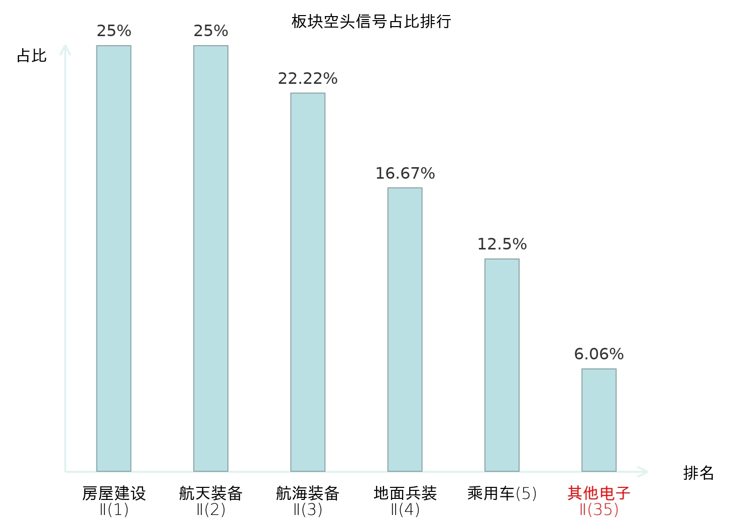 全市场所有行业板块中主力空头信号占比排名中,房屋建设Ⅱ板块位居第一。食品加工板块名次提升最快,较昨日上升110位。