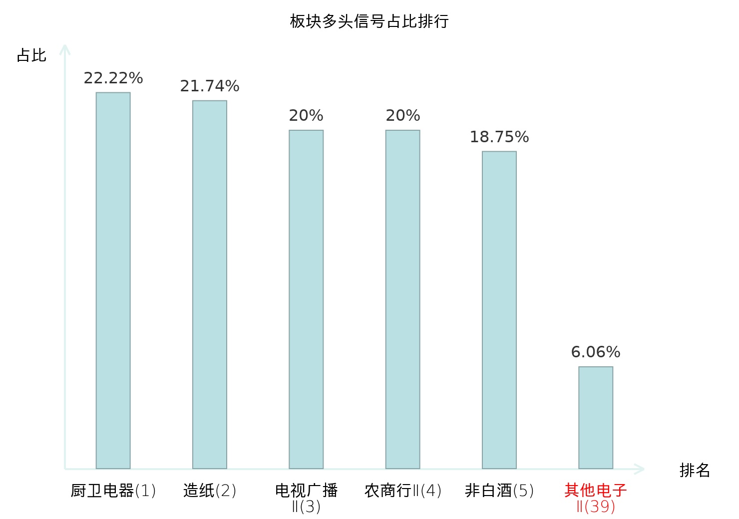 全市场所有行业板块中主力多头信号占比排名中,厨卫电器板块位居第一。厨卫电器板块名次提升最快,较昨日上升115位。