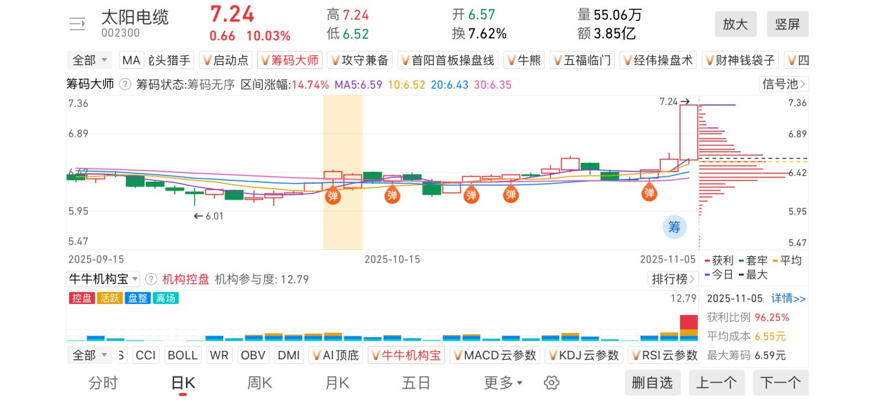 1)20251105-太阳电缆-【筹码大师】和【牛牛机构宝】-近期出现弹信号且底部量柱由绿转红
