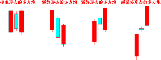 3)两阳夹一阴存在技术变形,强势程度也不相同,如下图所示。
