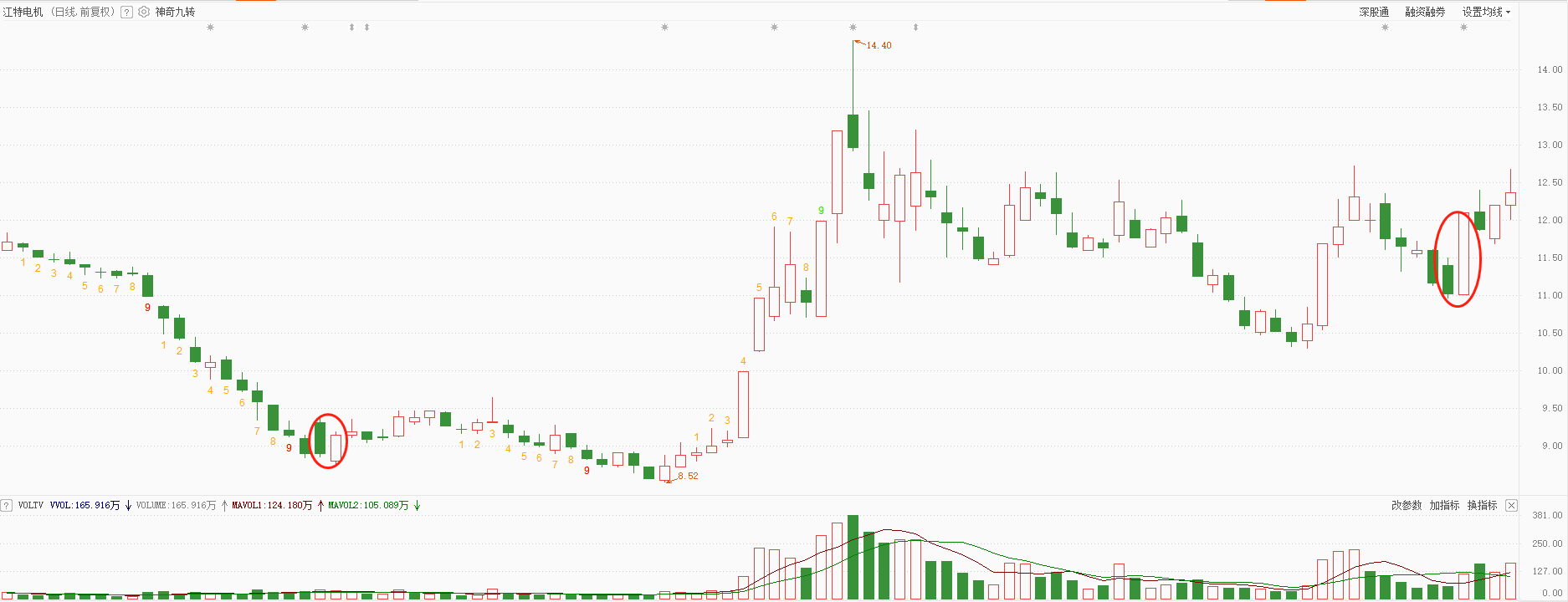 以江特电机为例,就出现了典型的曙光初现和旭日东升走势,这属于强烈的反转信号。