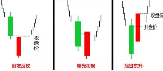 好友反攻、曙光初现、旭日东升K线形态相似,因此放在一起。