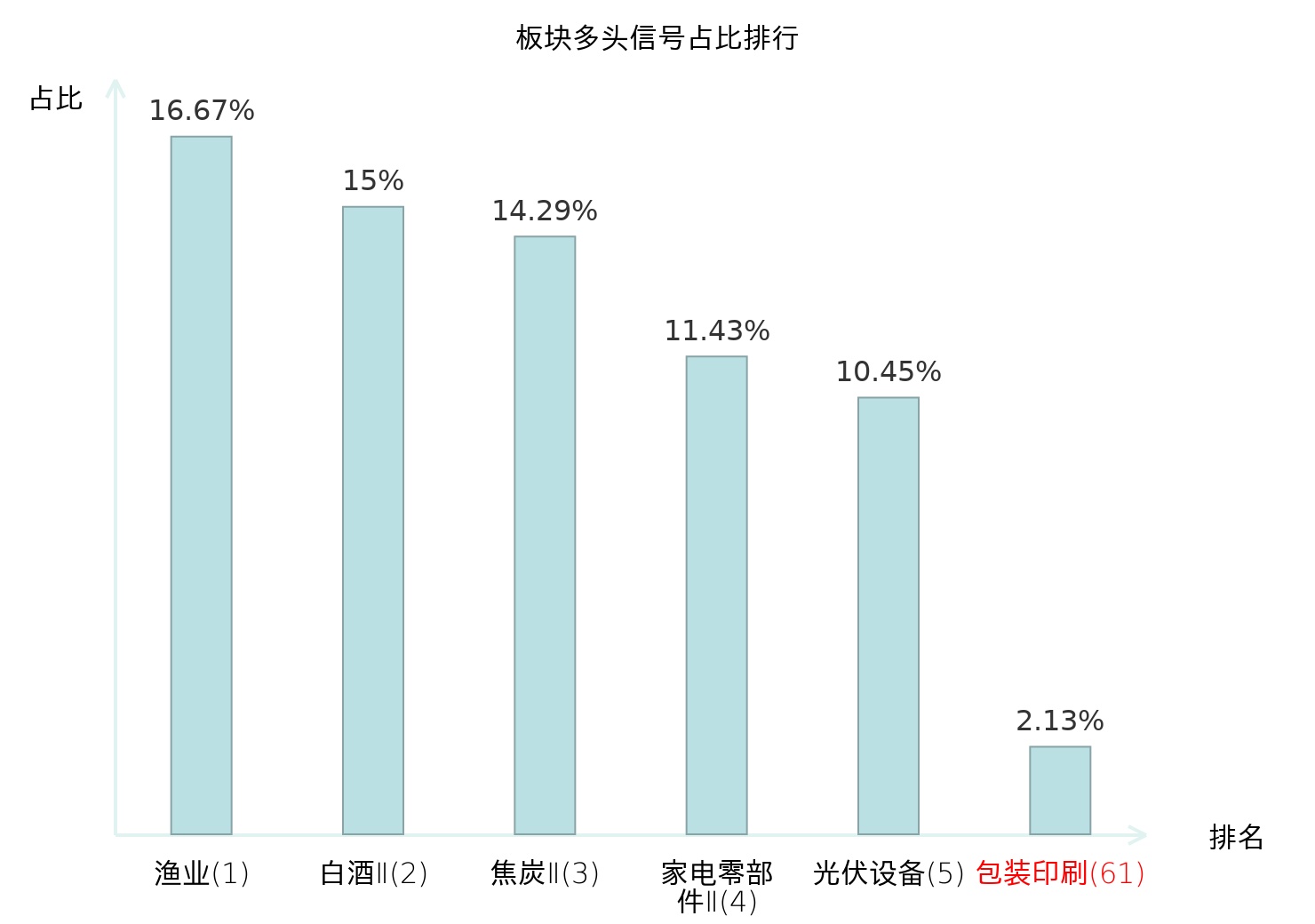 全市场所有行业板块中主力多头信号占比排名中,渔业板块位居第一。黑色家电板块名次提升最快,较昨日上升111位。