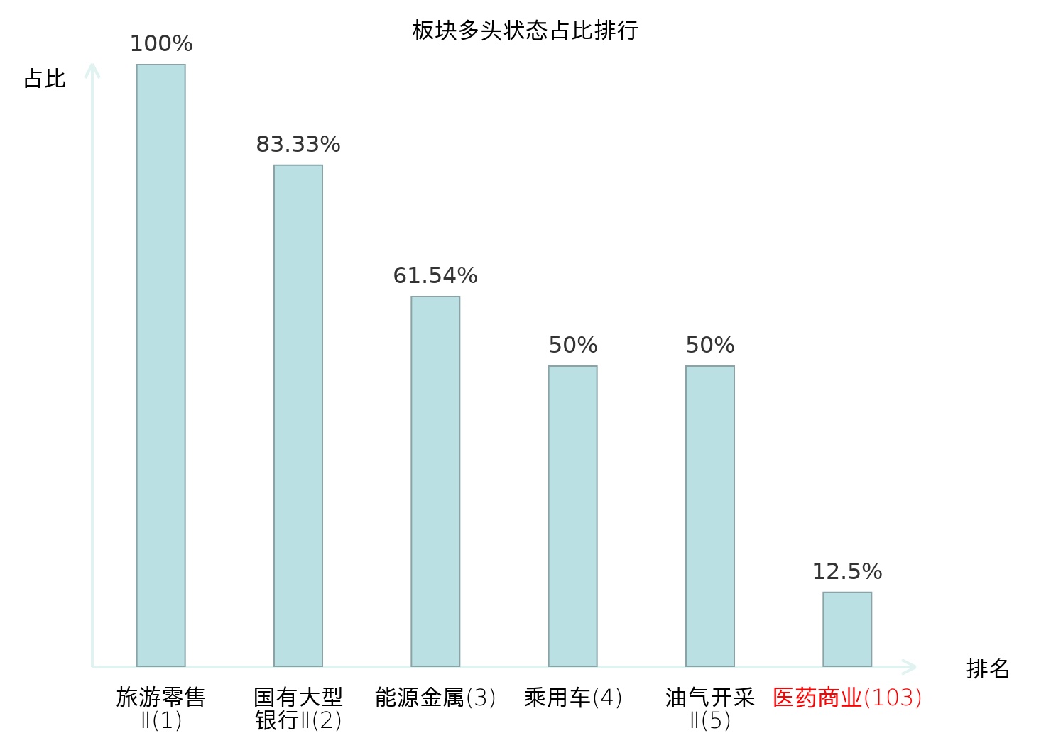 全市场所有行业板块中主力多头状态占比排名中,旅游零售Ⅱ板块位居第一。特钢Ⅱ板块名次提升最快,较昨日上升72位。