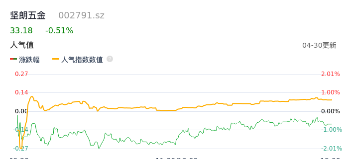 04月30日,坚朗五金收报33.18,股价涨幅-0.51%,成交金额1.14亿元,换手率2.10%。
