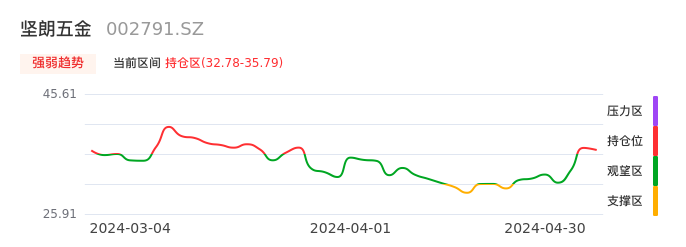 我们来看一下该股的九方特色指标强弱趋势的情况:坚朗五金近日从观望区上穿到持仓区。股价短期站上多头区域,但还未完全站稳。后续重点关注多空分界点的争夺:32.78元。如未能有效站稳则可能重新回到空头行情。