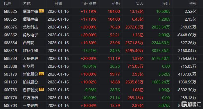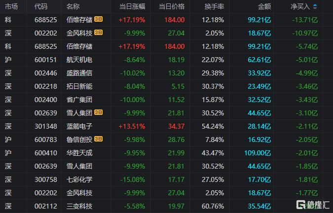 龙虎榜单日净卖出额前三为佰维存储、航天机电、盛路通信,分别为5.74亿元、5.01亿元、4.99亿元。