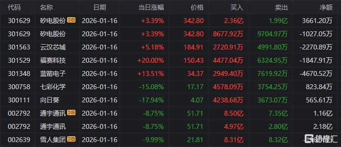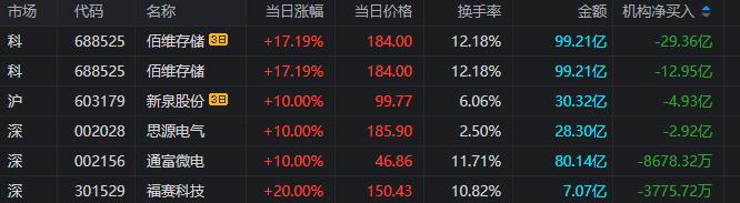 龙虎榜中涉及机构专用席位的个股中,当日净卖出额前三为佰维存储、思源电气、通富微电,分别为12.95亿元、2.92亿元、8678.32万元。