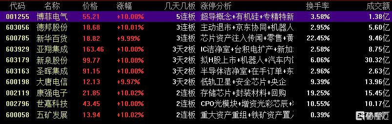 焦点股方面,智能电网板块博菲电气9天6板,股权转让的新华百货3连板,溢价主动退市的德邦股份3连板,资产重组的五矿发展3连板。