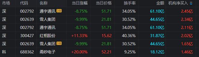 龙虎榜中涉及机构专用席位的个股中,当日净买入额前三为雪人集团、通宇通讯、红相股份,分别为2.34亿元、2.11亿元、2.02亿元。