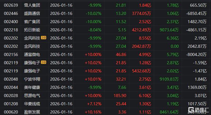 雪人集团:今日跌停,全天换手率30.52%,成交额44.65亿元,振幅8.12%。龙虎榜数据显示,机构净买入2.34亿元,深股通净买入665.56万元,营业部席位合计净卖出4.26亿元。