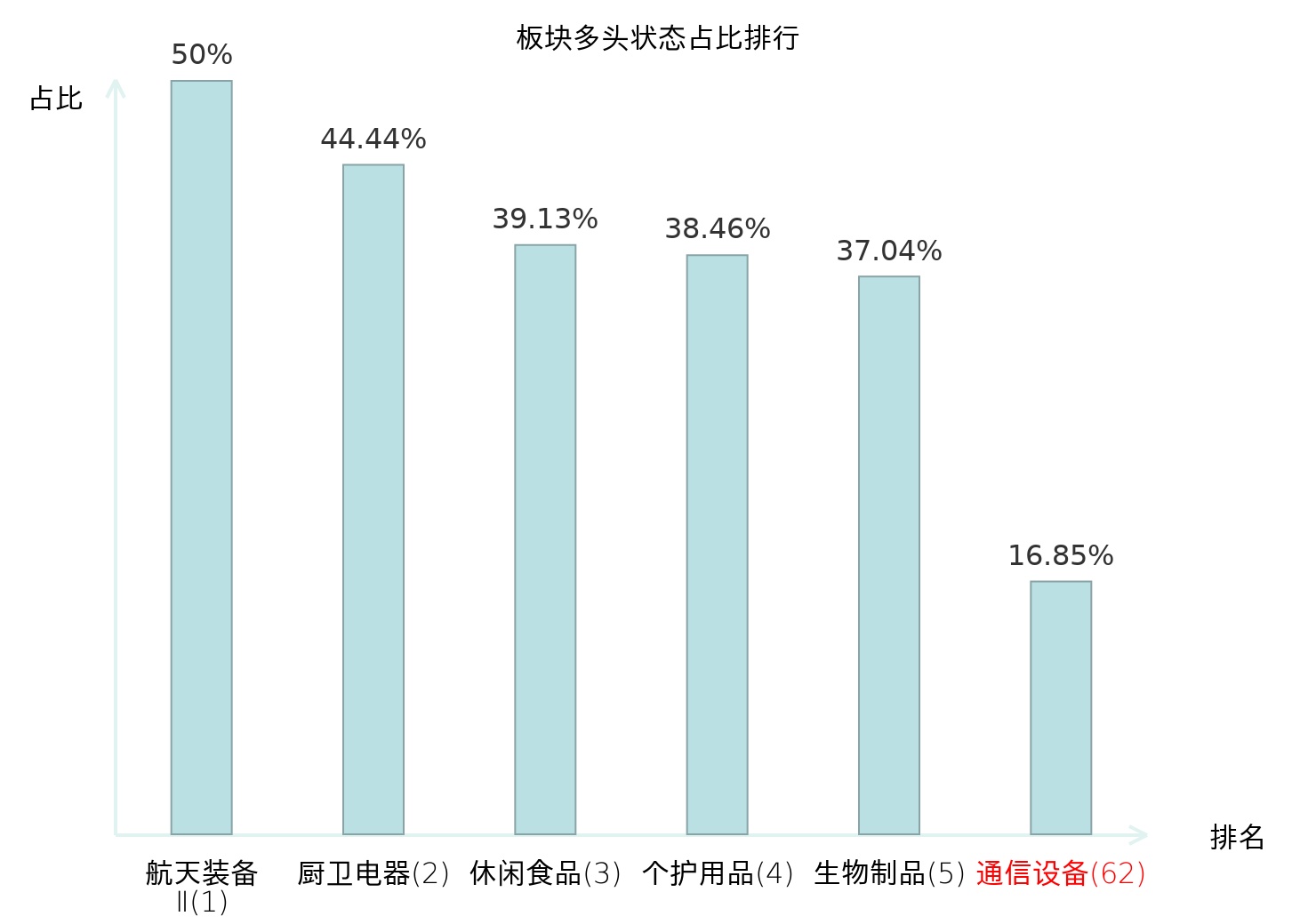 全市场所有行业板块中主力多头状态占比排名中,航天装备Ⅱ板块位居第一。小金属板块名次提升最快,较昨日上升53位。