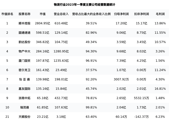 天顺股份最新报告期数据为一季度,下表汇总了物流行业内市值靠前的公司一季度主要经营数据