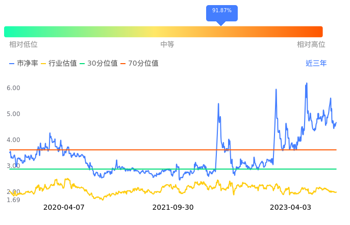 天顺股份当前市净率PB为4.68,在所属的物流中,市净率PB排41,前五名分别为瑞茂通市净率0.81、建发股份市净率0.82、物产中大市净率0.82、中国外运市净率0.87、中储股份市净率0.91。天顺股份当前市净率PB为4.68,超过近3年91.87%的历史数据。