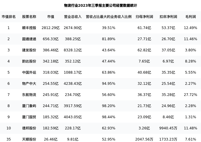 天顺股份最新报告期数据为三季报,下表汇总了物流行业内市值靠前的公司三季报主要经营数据