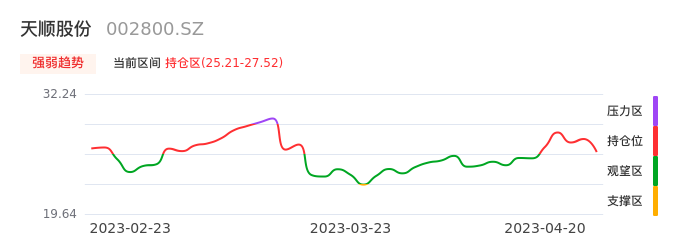 我们来看一下该股的九方特色指标强弱趋势的情况:天顺股份自04月14日从观望区上穿到持仓区。股价近期在多头区域回调整理。后续重点关注多空分界点的争夺:25.21元。如未能有效站稳则可能重新回到空头行情。