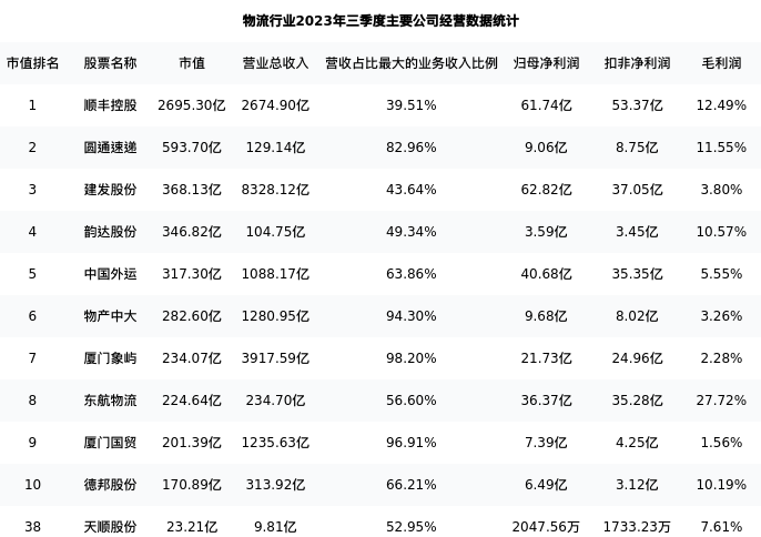 天顺股份最新报告期数据为三季度,下表汇总了物流行业内市值靠前的公司三季度主要经营数据