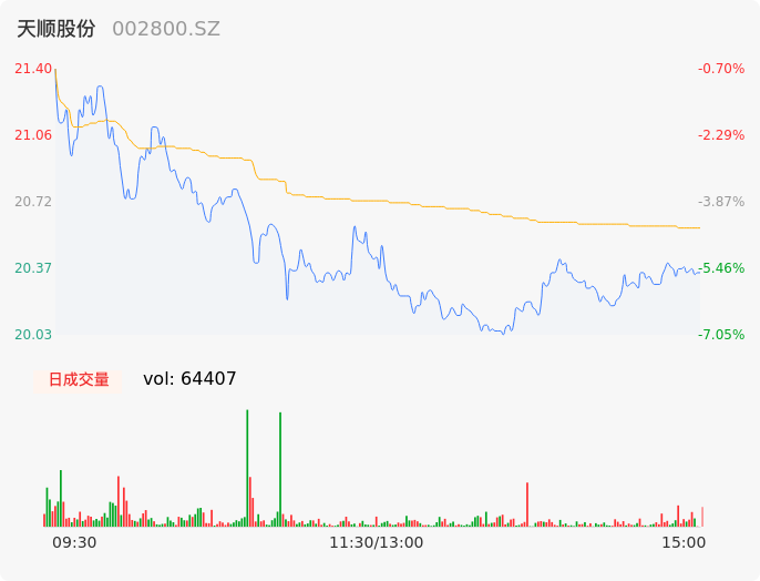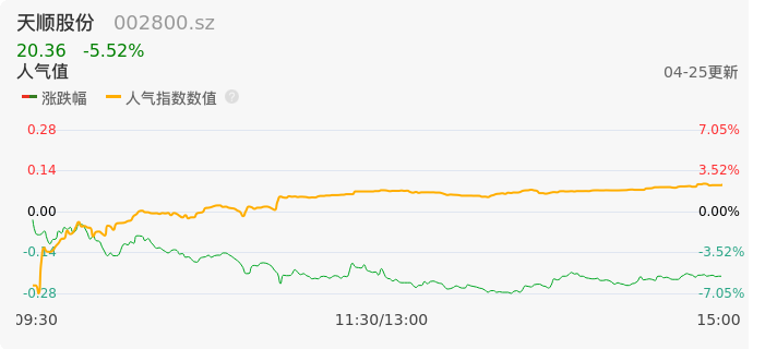 04月25日,天顺股份收报20.36,股价涨幅-5.52%,成交金额1.33亿元,换手率6.37%。