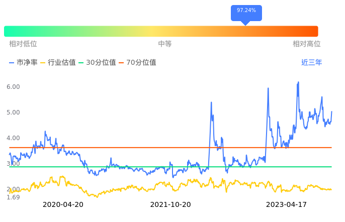天顺股份当前市净率PB为5.04,在所属的物流中,市净率PB排42,前五名分别为建发股份市净率0.84、瑞茂通市净率0.85、物产中大市净率0.91、中国外运市净率0.95、传化智联市净率0.97。天顺股份当前市净率PB为5.05,超过近3年97.24%的历史数据。