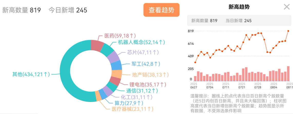 从百日新高,判断板块轮动节奏还是比较准的,昨日的百日新高数据重回升势,目前是在医药>机器人芯片>(自主可控)>军工,医药板块重回C位
