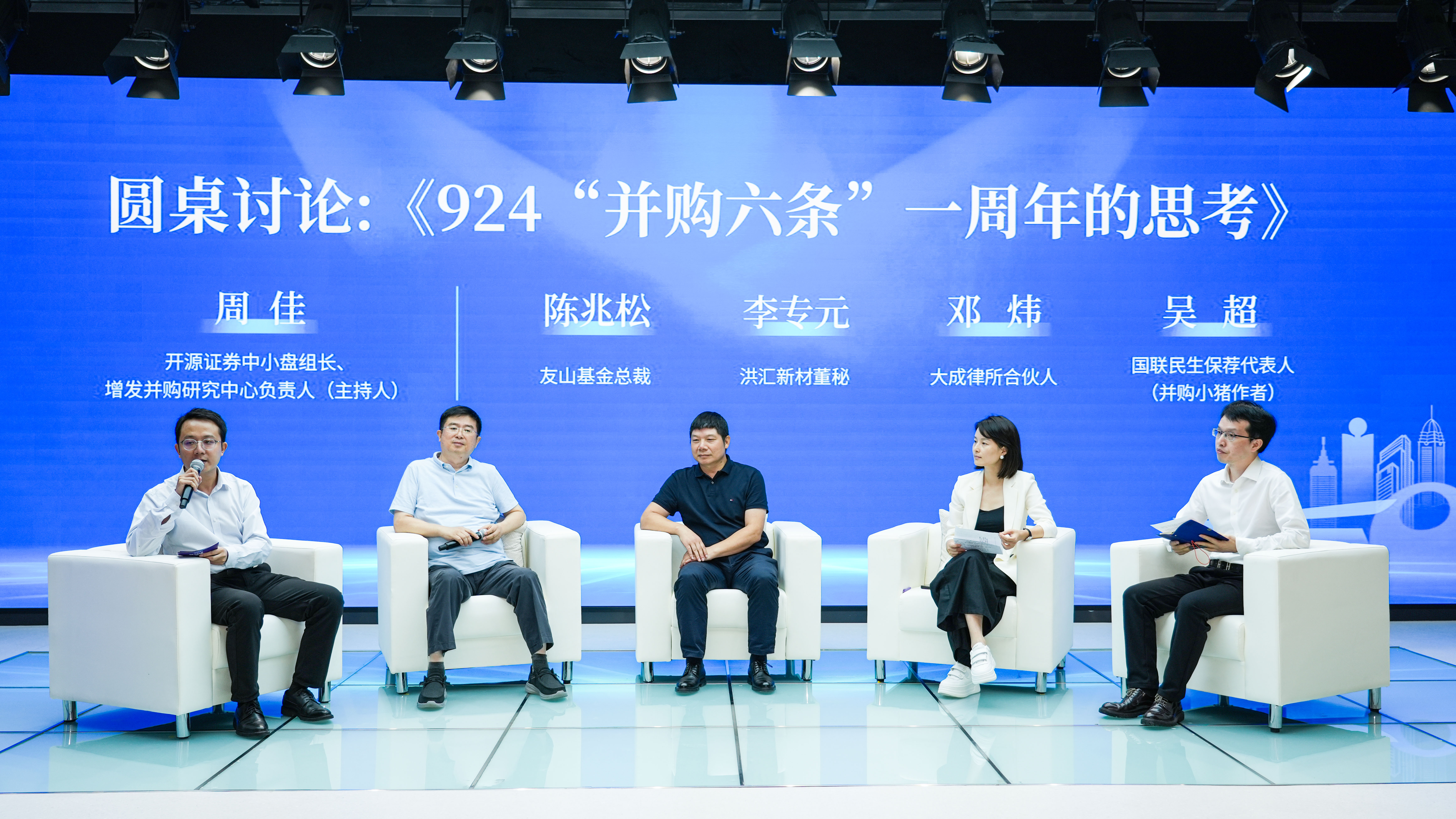 在随后的圆桌讨论环节,由开源证券开源证券中小盘组长、增发并购研究中心负责人周佳主持,友山基金总裁陈兆松、洪汇新材董秘李专元、大成律所合伙人邓炜、国联民生保荐代表人吴超等四位分别来自私募基金、上市公司、律所和投行的嘉宾,围绕“并购六条”推出一年后并购重组的市场变化、发展趋势和实践经验等内容展开了深入交流和探讨,为与会人员提供了多维度参考。