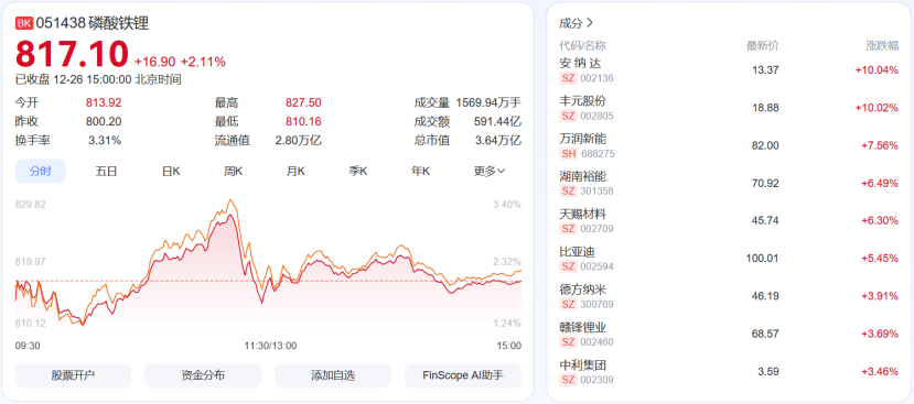 市场表现方面,截至12月26日收盘,磷酸铁锂板块整体上涨2.11%,安纳达、丰元股份强势涨停,万润新能、湖南裕能等个股亦跟涨明显。