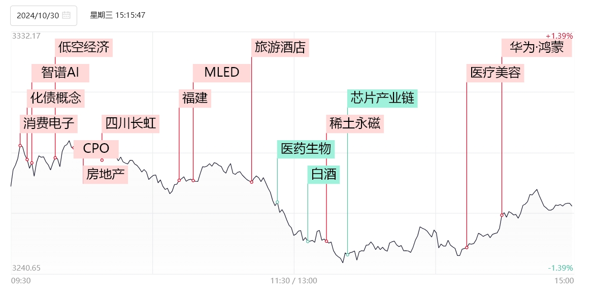 市场全天探底回升,创业板指领跌。沪深两市全天成交额1.85万亿,较上个交易日缩量2155亿。盘面上,华为概念股再度爆发,鸿蒙方向领涨,润和软件、常山北明、南天信息、天融信等涨停。消费电子概念股维持强势,格林精密、华映科技、欧菲光、福日电子等多股涨停。低空经济概念股再度拉升,建新股份、万丰奥威、上工申贝、中信海直等多股涨停。Mini LED概念股震荡走强,TCL科技、万润科技、沃格光电、冠捷科技等涨停。ST板块逆势活跃,ST东时、ST百利、ST恒久、*ST景峰等30余股涨停。下跌方面,芯片股展开调整,中芯国际等多股跌超5%。整体上个股跌多涨少,全市场超2900只个股下跌。板块方面,智谱AI、ST板块、消费电子、Mini LED等板块涨幅居前,白酒、医疗器械、电池、半导体等板块跌幅居前。截至收盘,沪指跌0.58%,深成指跌0.12%,创业板指跌1.18%。