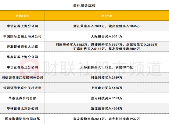 量化资金活跃度一般,天际股份遭一家量化席位做T。另有两家量化席位买入浙江荣泰。