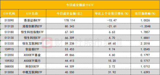 从成交额前十的ETF来看,香港证券ETF(513090)成交额位居首位,港股创新药ETF(513120)成交额位居次席。